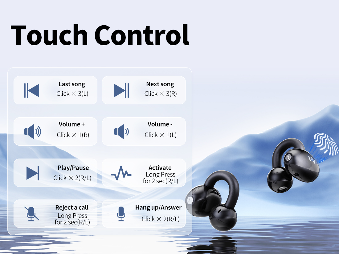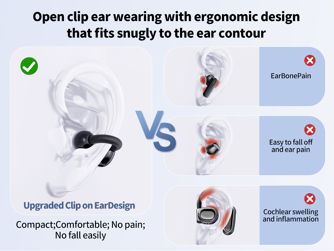 The open ear clip design is ergonomically designed to fit the contours of your ears and will not fall out easily. Let you experience senseless wearing, can't feel its existence.