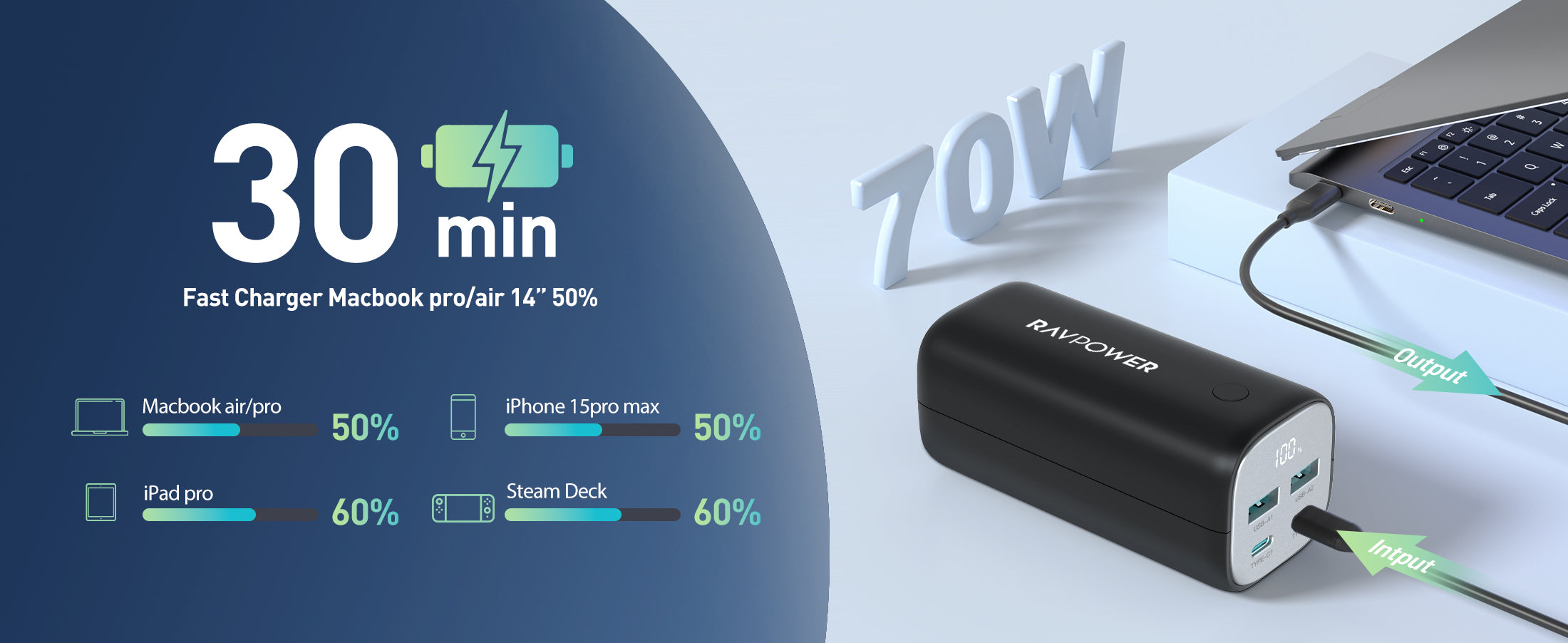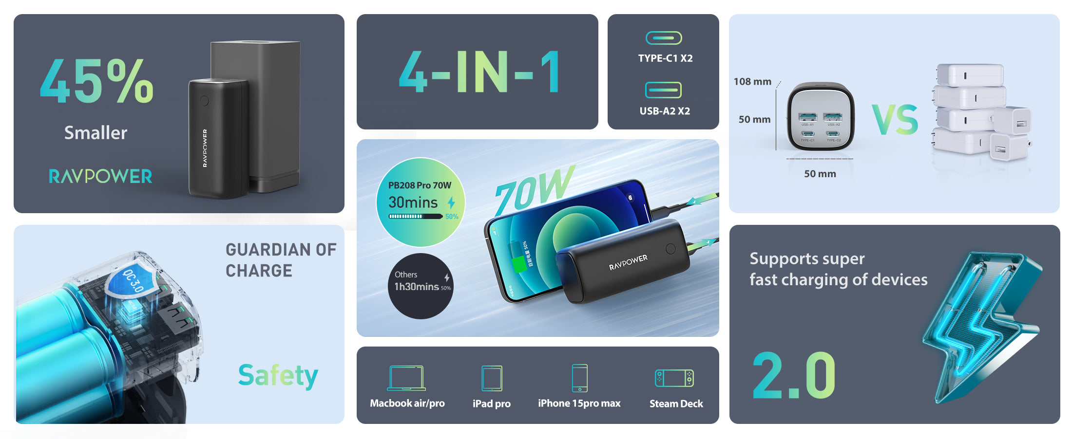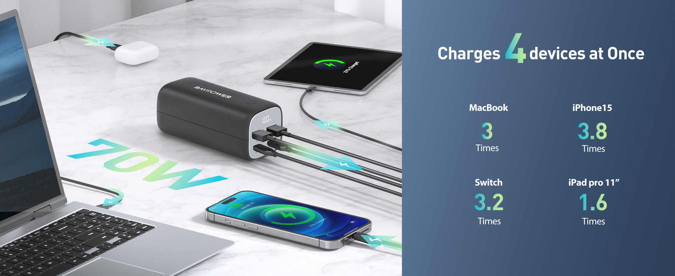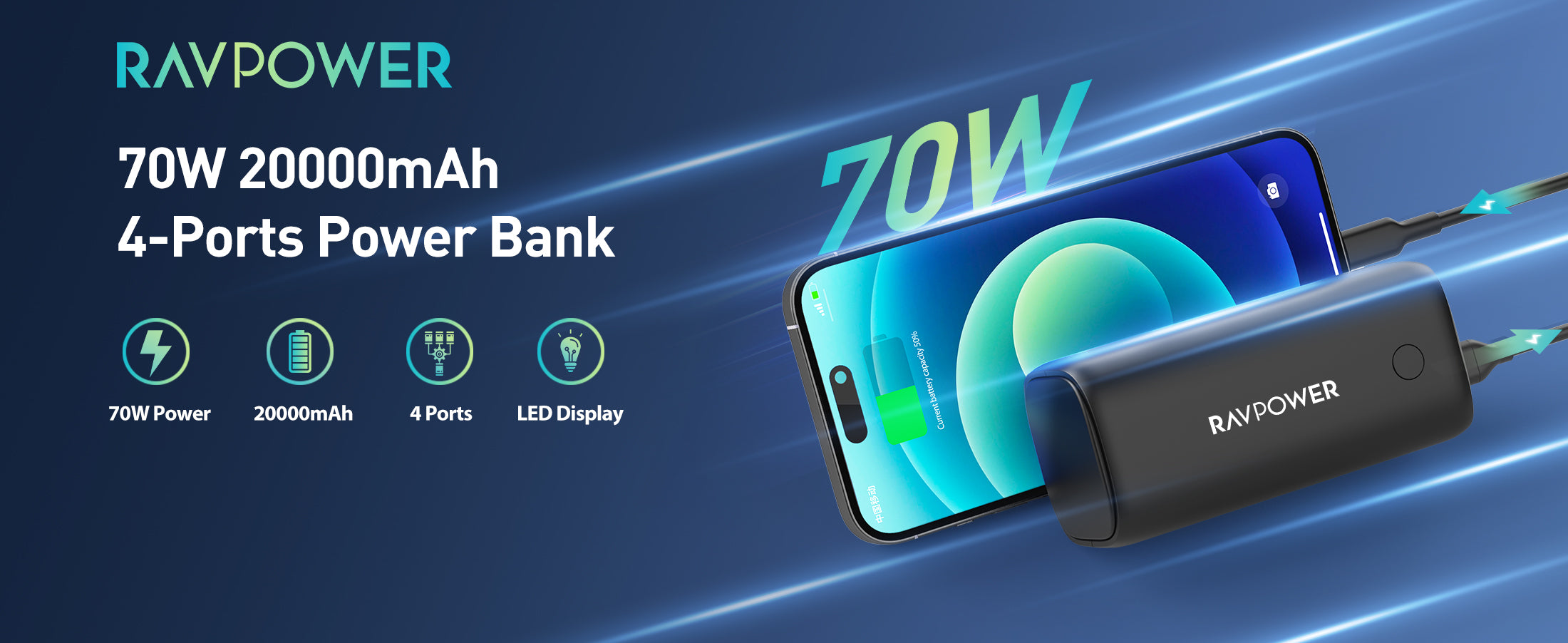 Ravpower RP-PB208Pro 20000mAh GaN PD65W 4-Port Portable Charger Offline Black