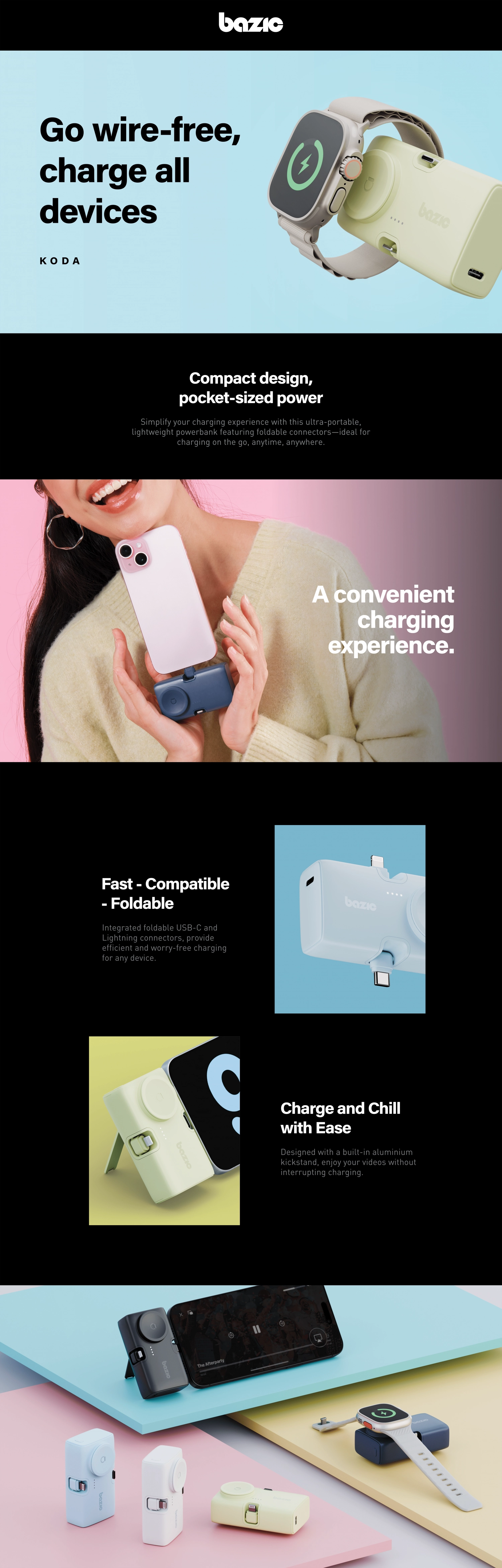 Discover the sleek, pocket-sized power bank designed for convenience. It includes USB-C and Lightning connectors, along with a built-in Apple Watch charger, offering a 5,000mAh capacity. Perfect for giving your devices a quick charge on the move, now available in a variety of stylish colors to match your lifestyle.